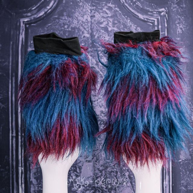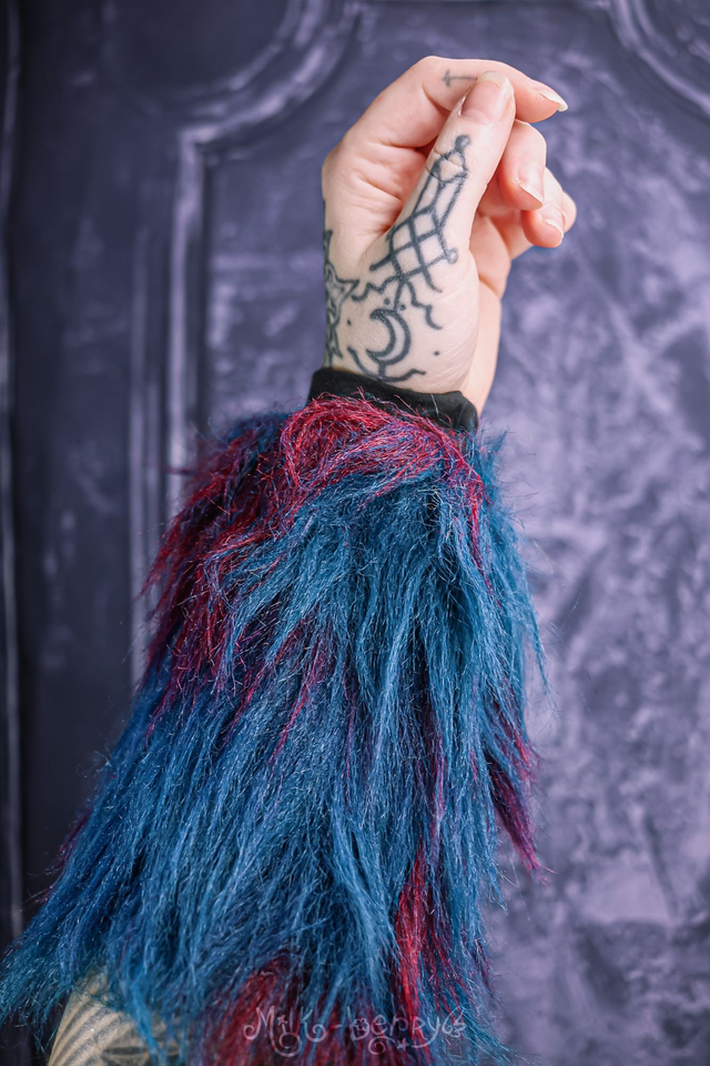 Paire de manchettes en fausse fourrure bleu marine et bordeaux réalisée avec des chutes de tissus et achevée par un poignet en jersey noir.