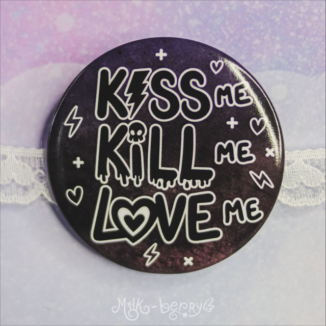 Badge "Kiss Me, Kill Me, Love Me". Petit clin d’œil aux paroles d'une chanson d'un certain groupe japonais, mais si vous n'êtes pas de la génération visual kei et n'avez pas la ref, vous pouvez aussi apprécier ce design pour ce qu'il est :)