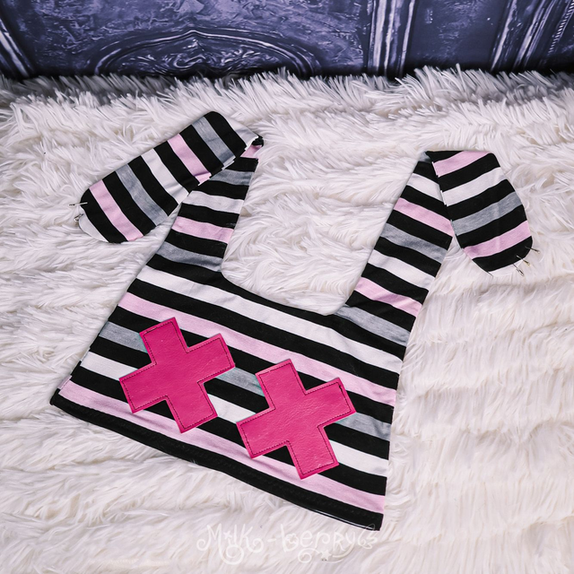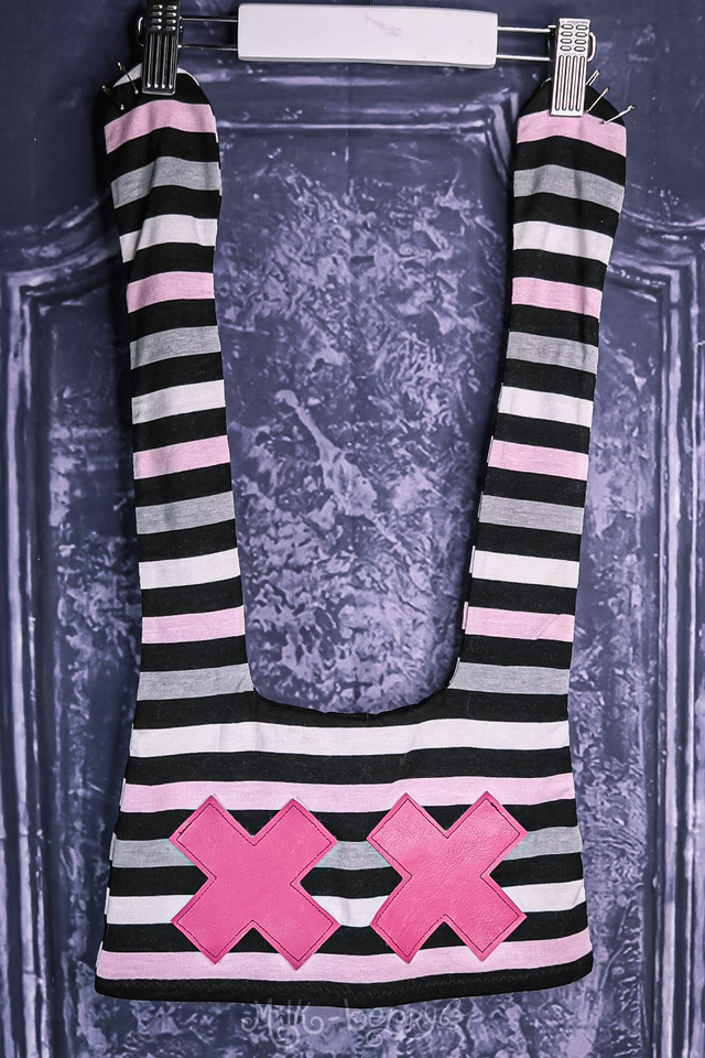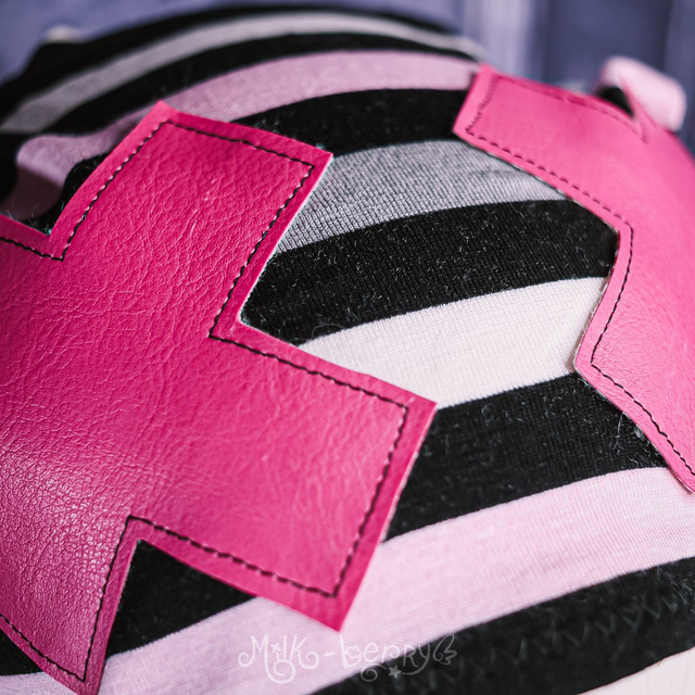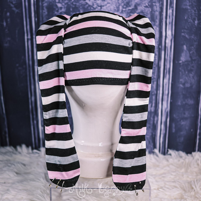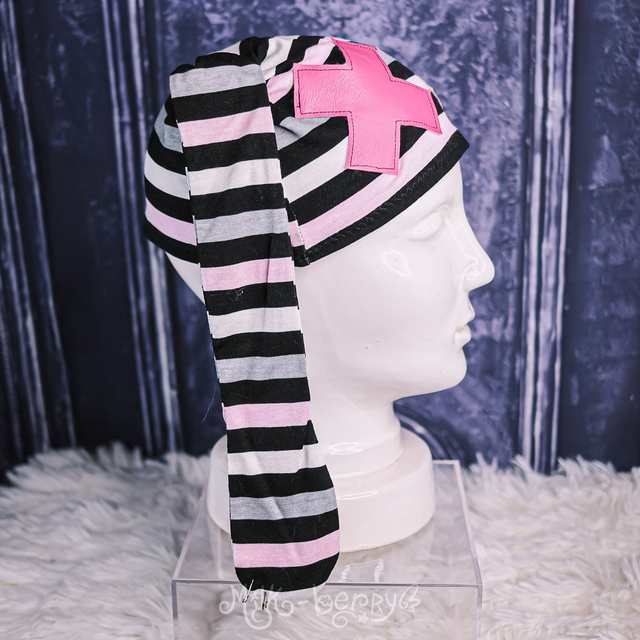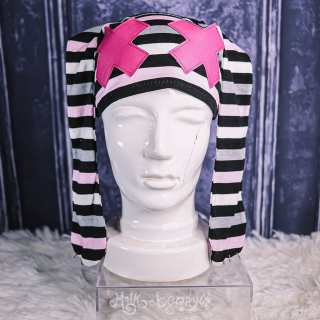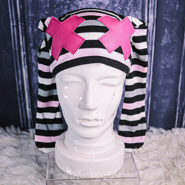 Ce bonnet s'inspire de la mode d'Harajuku des années 2000. Réalisé en tissu extensible rayé noir - rose - blanc - gris, il est agrémenté de croix en simili cuir rose. Des épingles à nourrice décorent les oreilles. Il vous donnera un petit coup de nostalgie si la mode alternative des années 2000 vous manque et complètera vos looks d'inspiration Harajuku, Goth, Punk, Grunge, Lolita, Emo, Y2K.