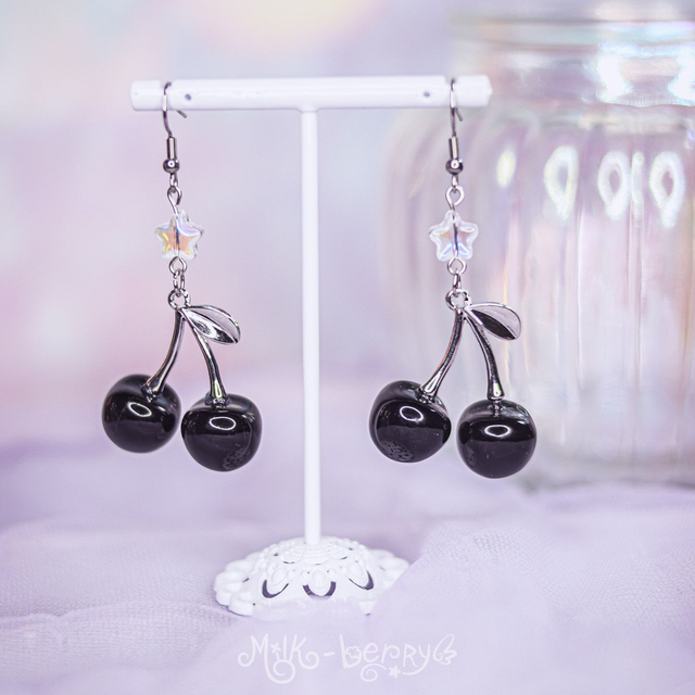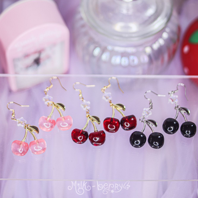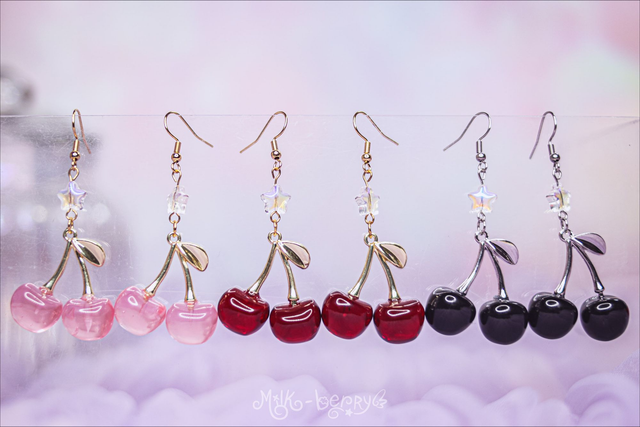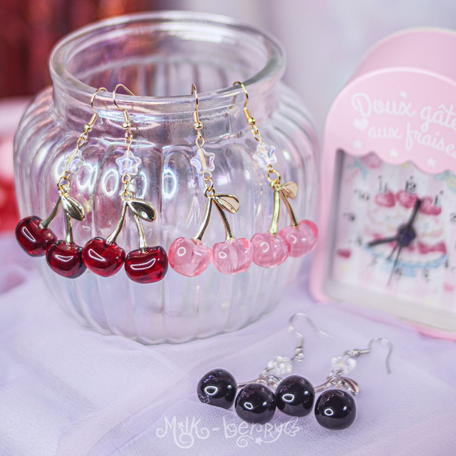 🍒 Vous adorez les cerises ? Craquez pour ces Boucles d'oreilles Cerise ! Elles présentent une élégante cerise en résine disponible en plusieurs coloris, surplombée d'une perle étoile. Parfait pour une coordi Sweet Lolita avec un print fraise, mais aussi pour toutes vos tenues Kawaii, Harajuku, Lolita, Decora, Fairy Kei... Ou juste pour ajouter une touche gourmande à vos looks casuals 😙