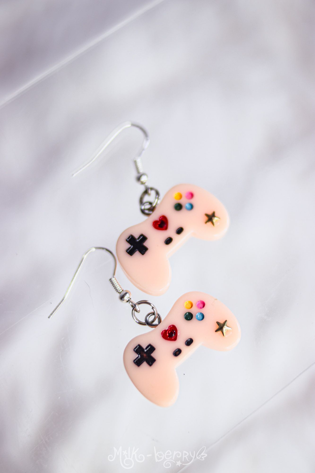 🎮 Pour les Gamers dans l'âme, ces boucles d'oreilles présentent un pendentif en forme de manette rose pâle, orné de strass et d'une petite étoile dorée.