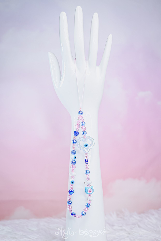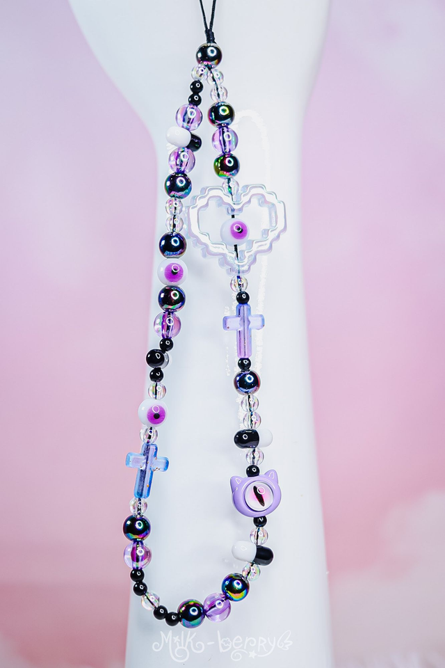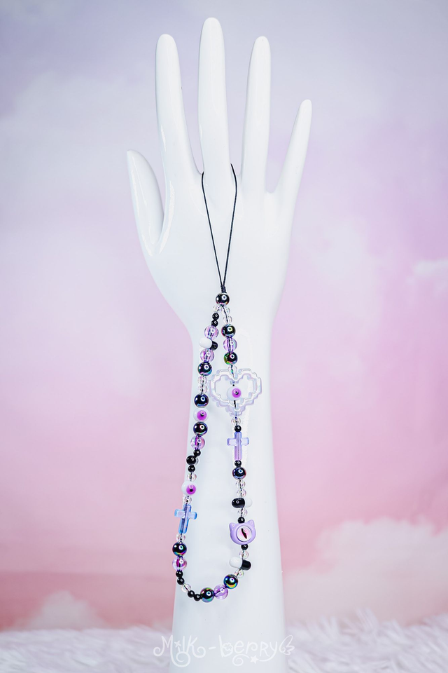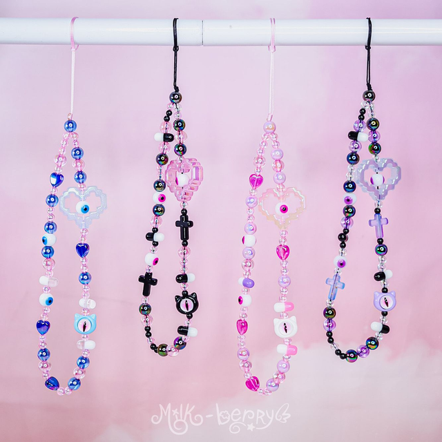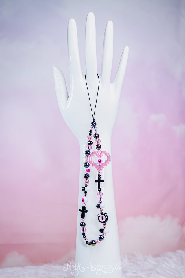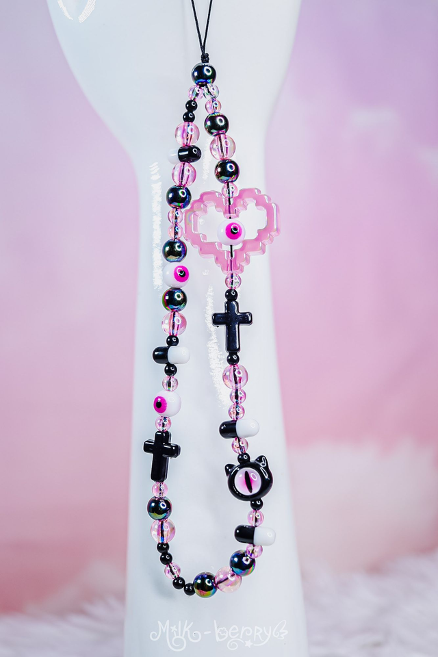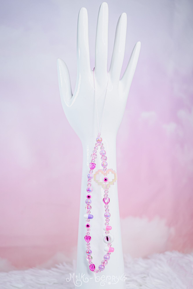 💖 Pimpez votre téléphone avec ces bracelets de téléphone aux vibes yamikawaii / pastel goth ! Orné d'une grosse perle cœur pixelisé, de petites perles dont des pilules et des yeux ainsi que d'une perle tête de chat avec un œil, ils ajouteront une touche de fantaisie tout en vous aidant à ne plus perdre votre smartphone.