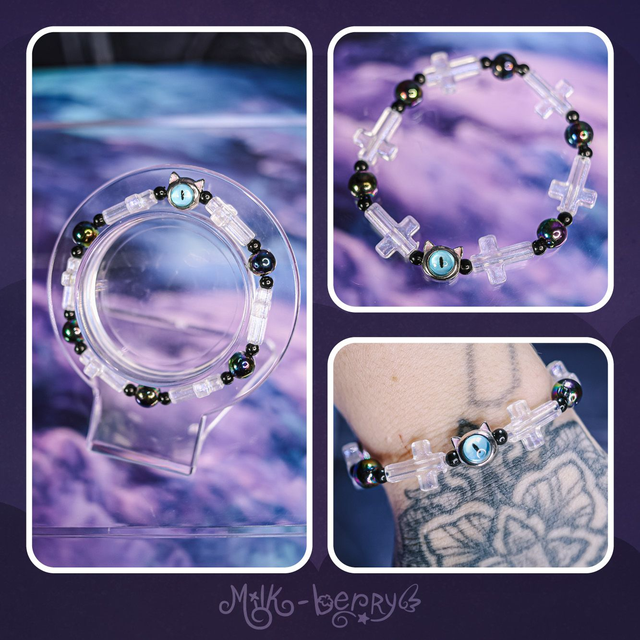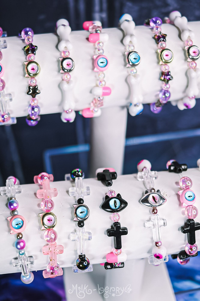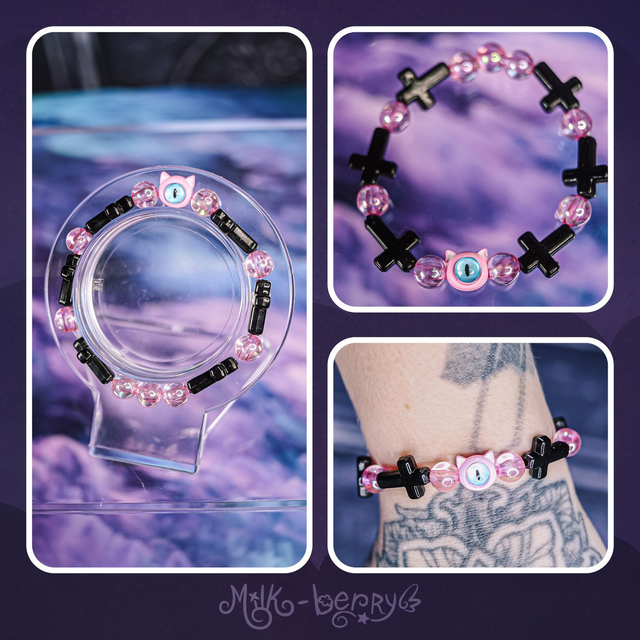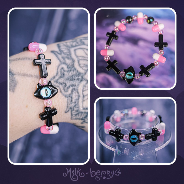 ✨ À la fois mignons et effrayants, ces bracelets d'inspiration Pastel Goth se composent d'une perle chat à l'œil maléfique accompagnée de perles fantaisie aux inspirations sombres : croix, ossements, pilules, yeux. Ils complèteront avec brio vos looks Goth, Lolita, Yamikawaii ou ajouteront une note creepy à vos tenues plus classiques !