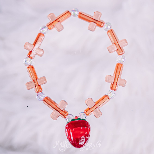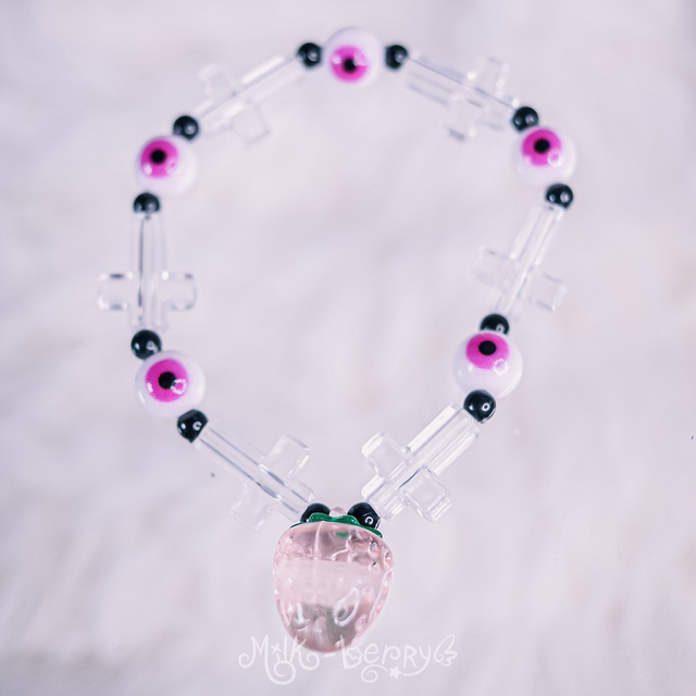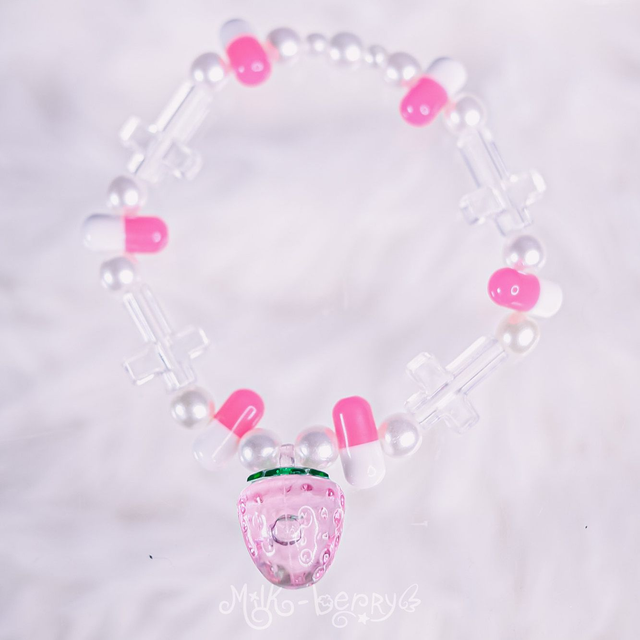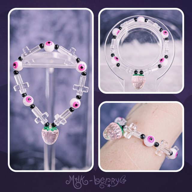 🍓 Ces bracelets à pendentif fraise sont agrémentés de perles en forme de croix, petites pilules, yeux ou os, nickel pour ajouter une touche Pastel Goth / Yamikawaii à vos tenues.