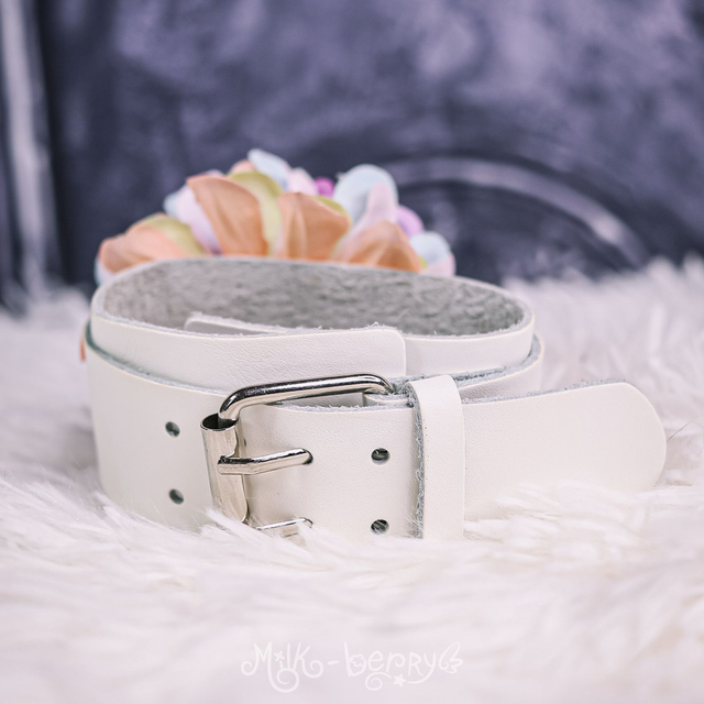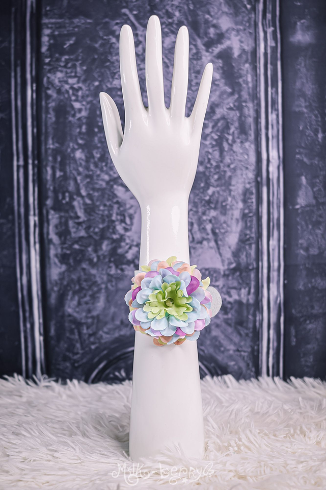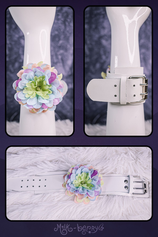 Bracelet en simili cuir blanc customisé avec une fleur synthétique aux pétales pastel multicolores, avec un pique en guise de pistil, pour une esthétique goth teintée de romantisme.