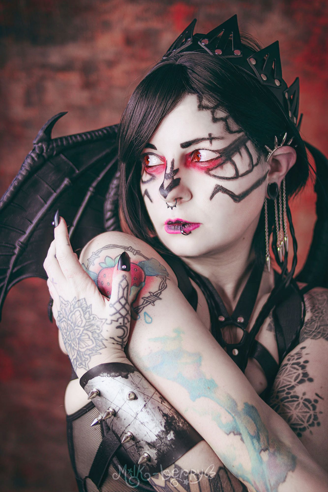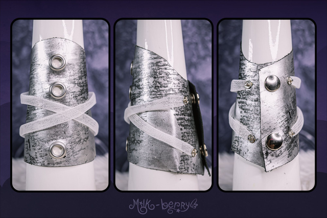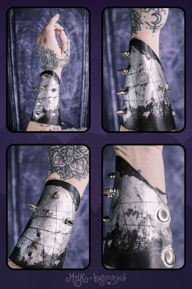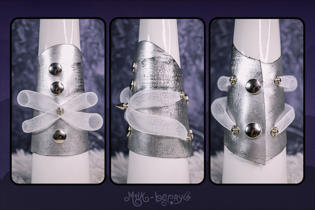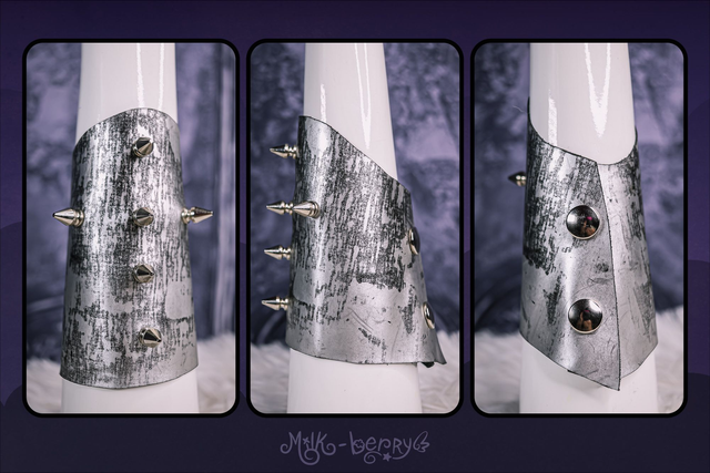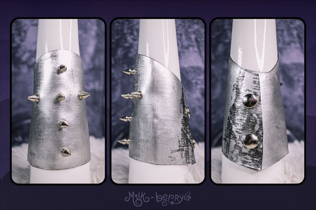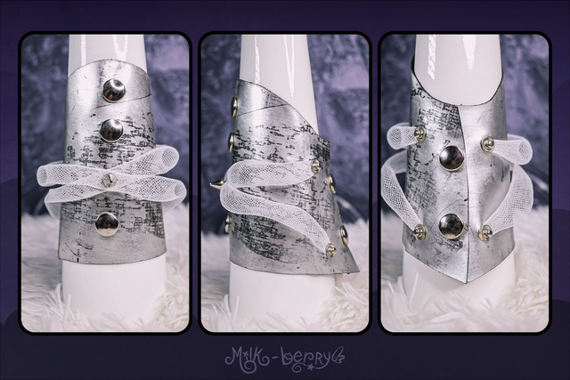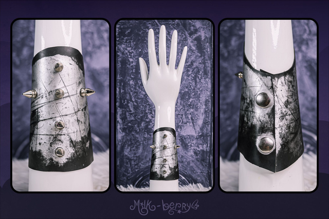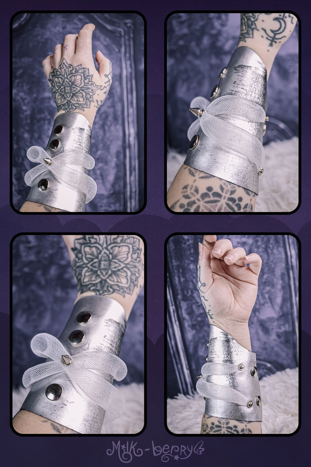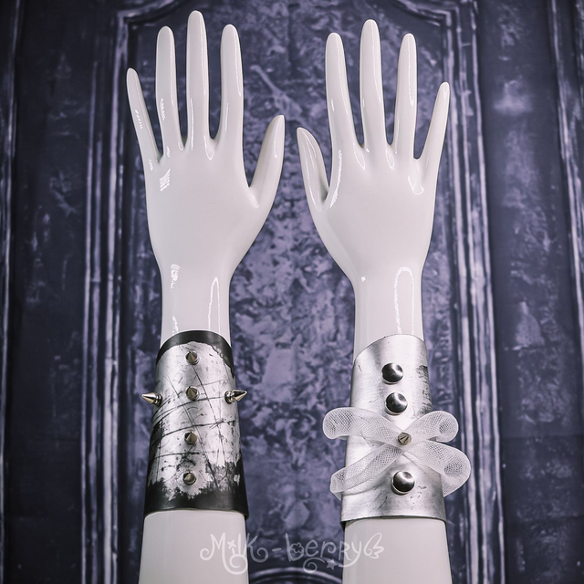 Réalisés en simili cuir argenté volontairement abîmé, ces bracelets manchettes affirment leur inspiration Cybergoth. Ils sont décorés soit de spikes disposés en forme de croix, soit de tuyaux blancs, et s'attachent par un épais bouton-pression qualitatif.