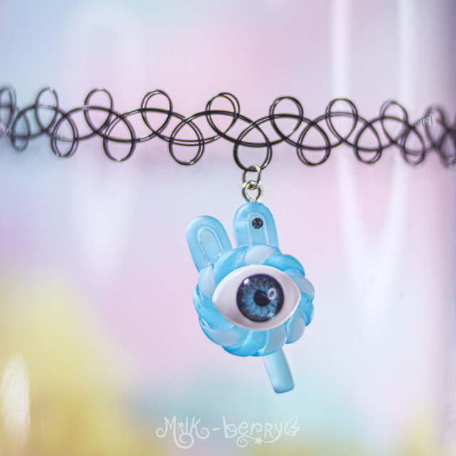 👁️ Ce collier ras-de-cou rétro présente un pendentif sucette lapin avec un gros œil. Parfait pour ajouter une touche pastel goth / creepy cute à vos looks.