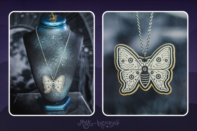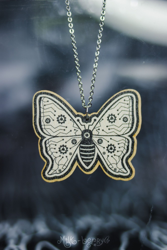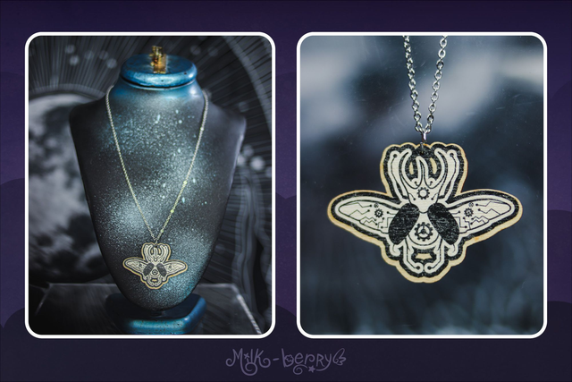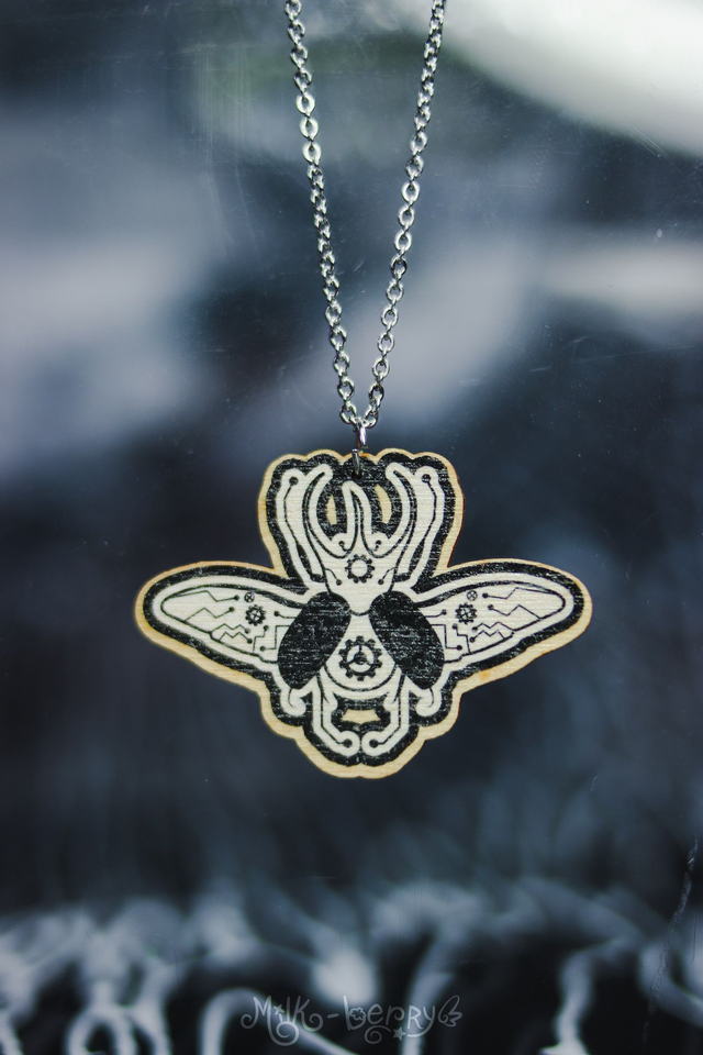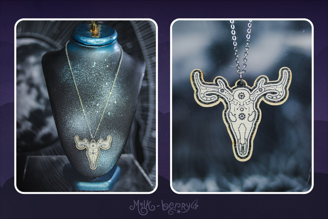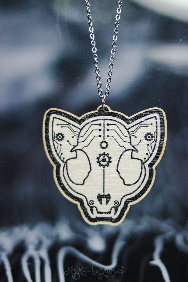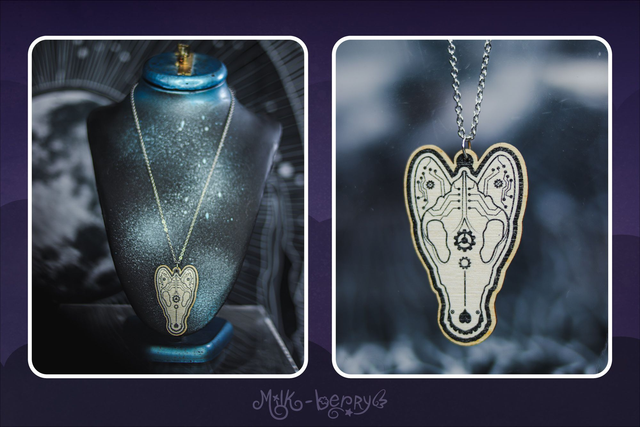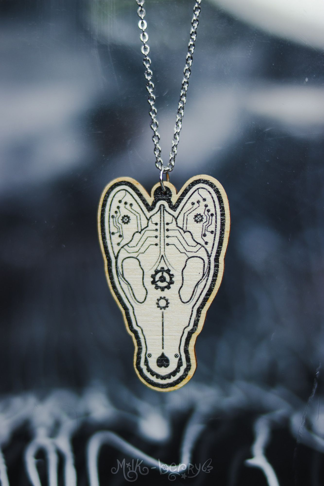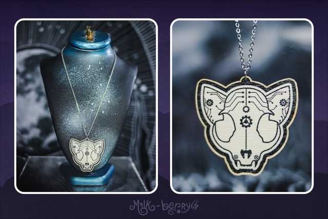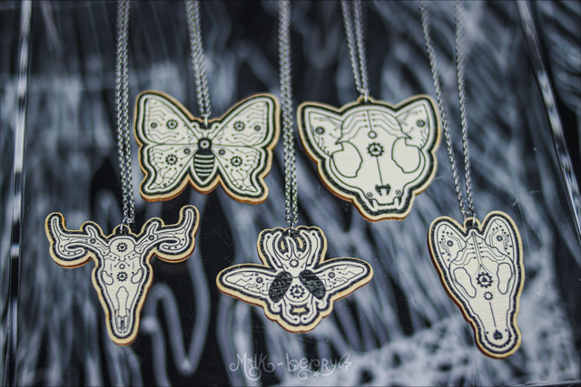 💖 Colliers en Bois. Ambiance Cabinet de Curiosités, motif Crâne d'Animal & Insectes façon Cyberpunk / Steampunk : Chien, Chat, Cerf, Papillon et Scarabée (Chalcosoma Atlas). Dessins réalisés par mes soins.