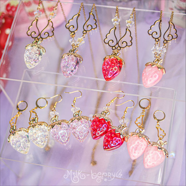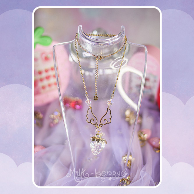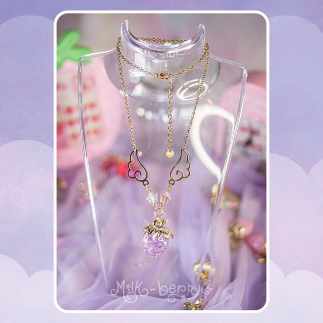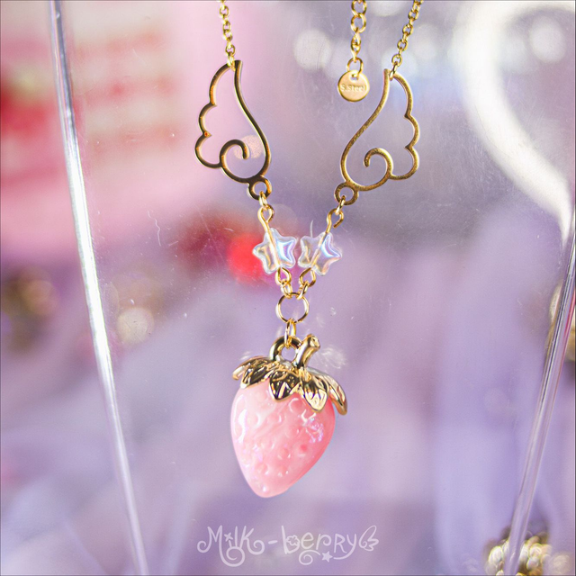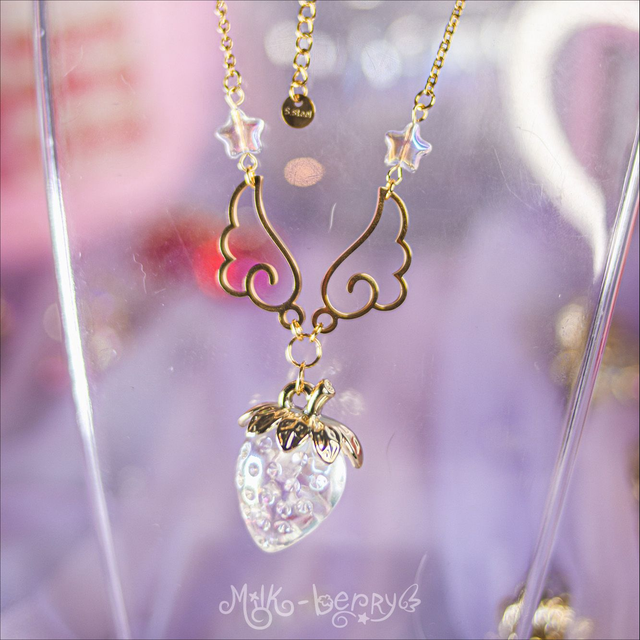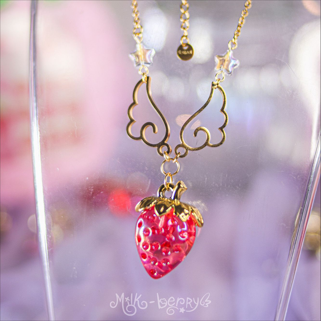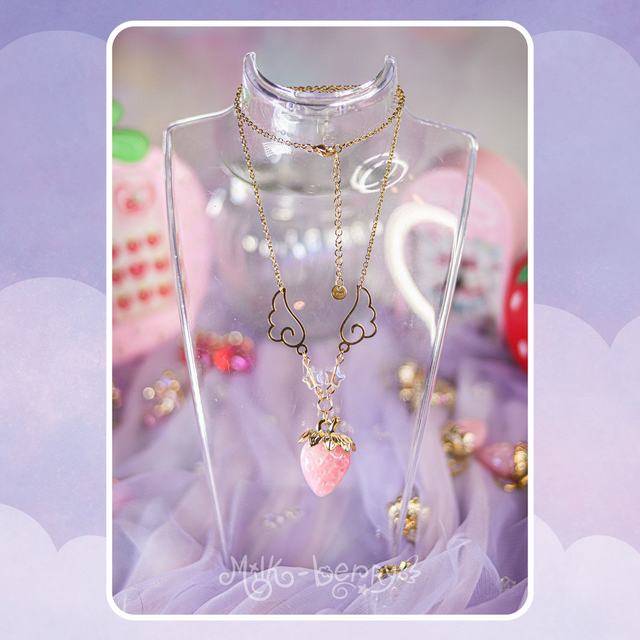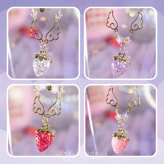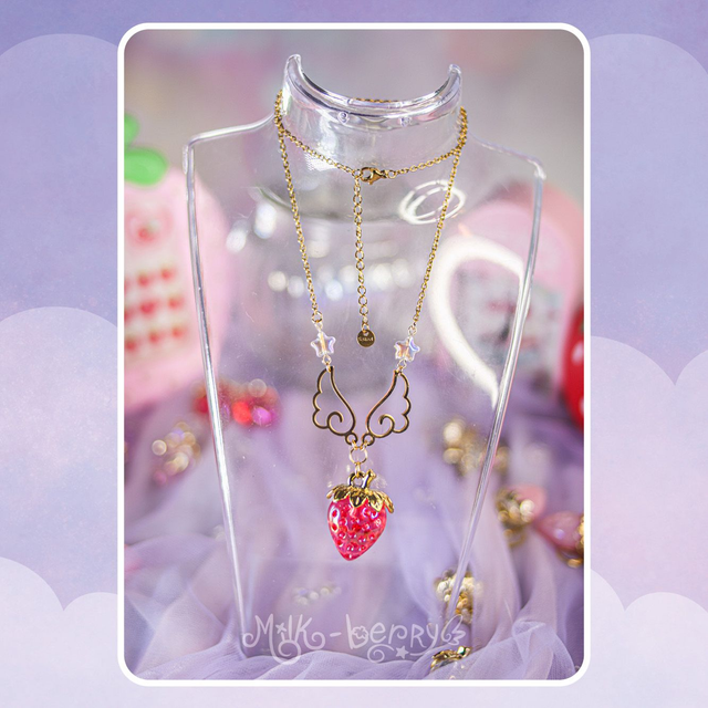 🍓 Vous adorez les fraises ? Moi aussi ! C'est pour ça que j'ai conçu les Colliers Fraise Céleste. Ils présentent une élégante fraise en résine disponible en plusieurs coloris, surplombée d'ailes en acier inoxydable et de perles étoiles. Parfait pour une coordi Sweet Lolita avec un print fraise, mais aussi pour toutes vos tenues Kawaii, Harajuku, Lolita, Decora, Fairy Kei... Ou juste pour ajouter une touche gourmande à vos looks casuals 😙
