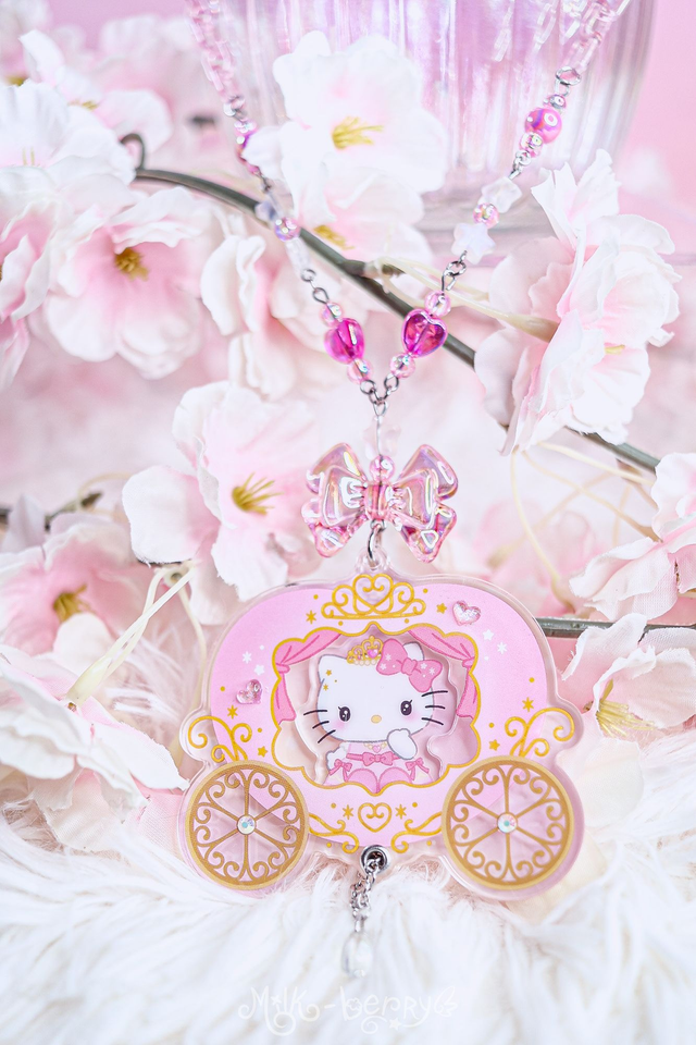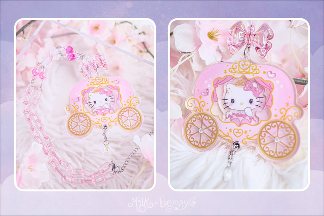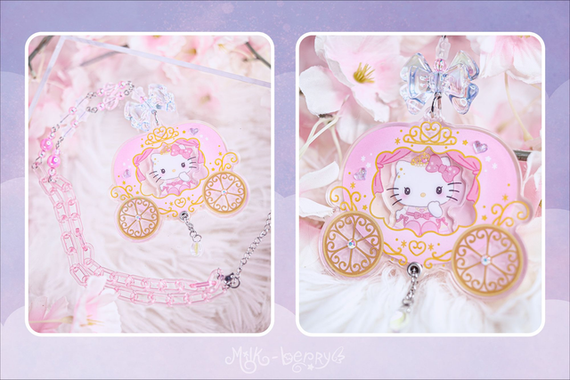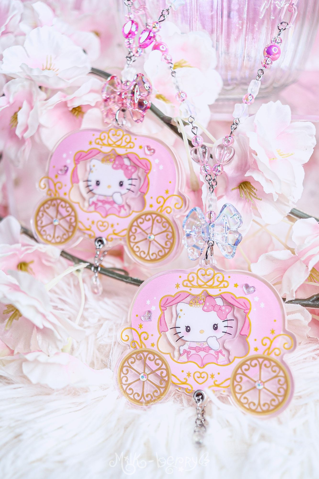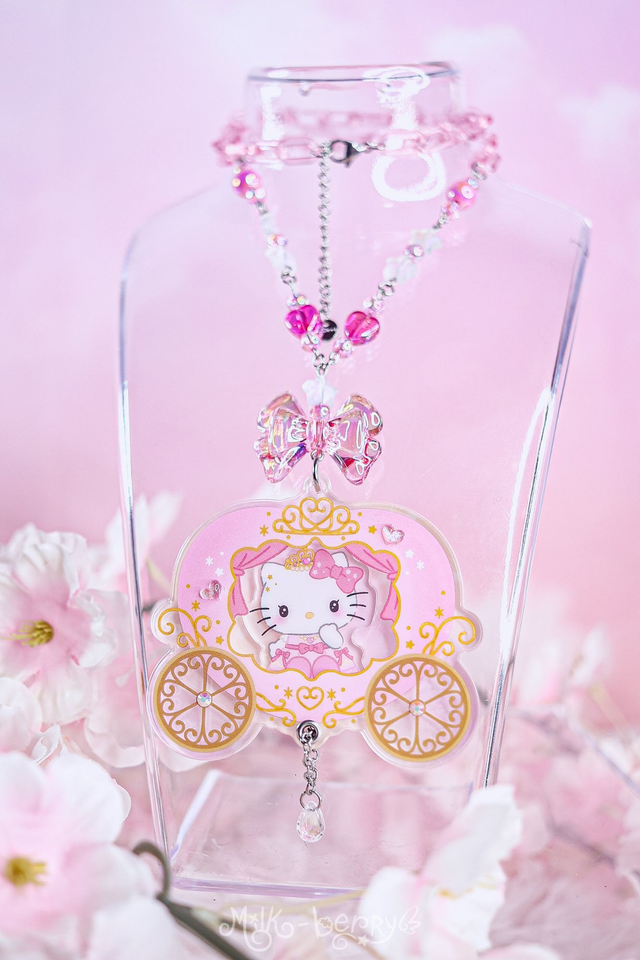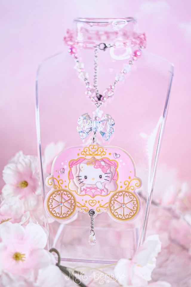 💖 Ces colliers ont été créés en détournant des goodies officiels Hello Kitty, chinés au Japon en magasin de seconde main. Ils présentent Hello Kitty dans un carrosse de princesse avec une perle en forme de goutte et sont montés sur une chaîne en acrylique coloré ornée de perles fantaisie.