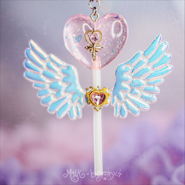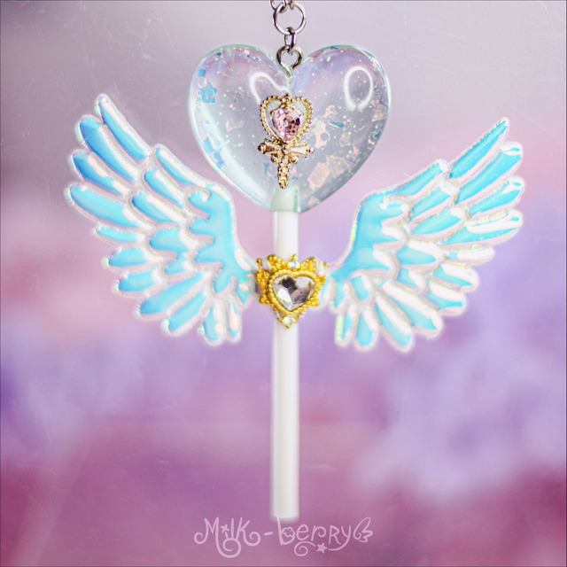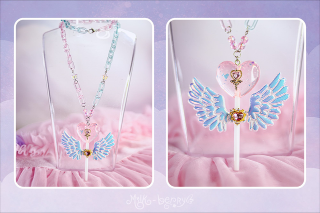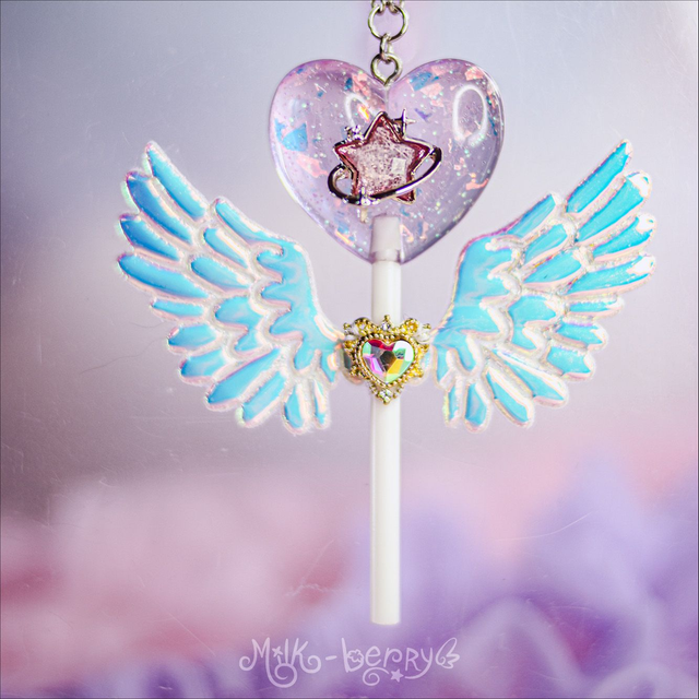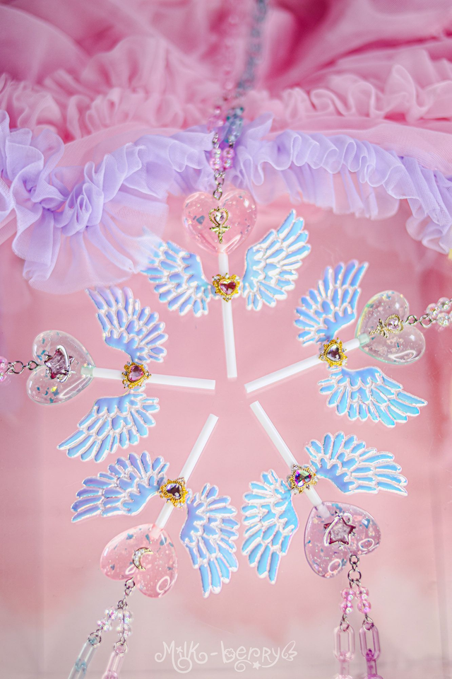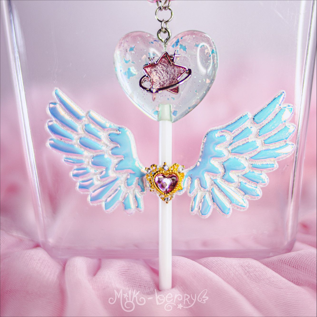 🍭 Ces sucettes pastel en forme de cœur à paillettes possèdent des ailes iridescentes. La forme n'est pas sans faire penser aux sceptres de Magical Girls. De quoi achever vos tenues Lolita, Fairy kei, Decora, Harajuku et autres avec une touche de magie, ou booster vos looks casual avec un accessoire kawaii !