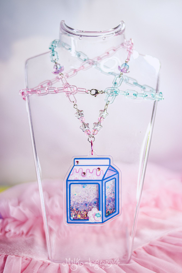 🥛 Ce collier shaker représente une brique de lait à la fraise ornée de fleurs de sakura et agrémentée de strass rose, le tout dans des teintes pastel douces. Réalisé en acrylique, il contient des paillettes roses holographiques dans du liquide pour une stimulation visuelle des plus plaisantes et est monté sur une chaîne colorée en acrylique ornée de perles fantaisie.