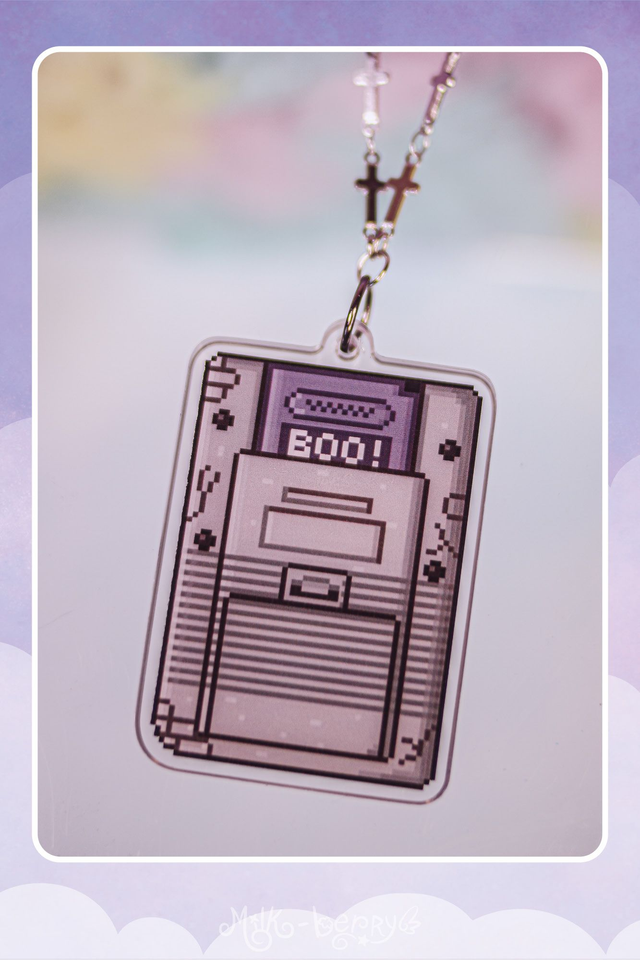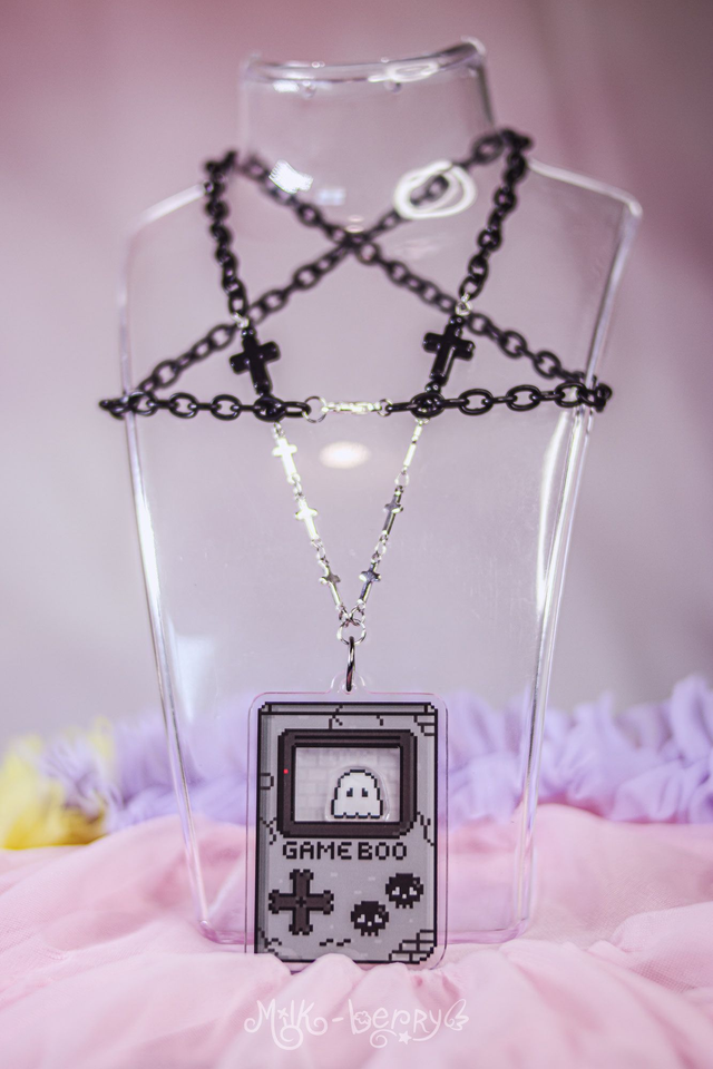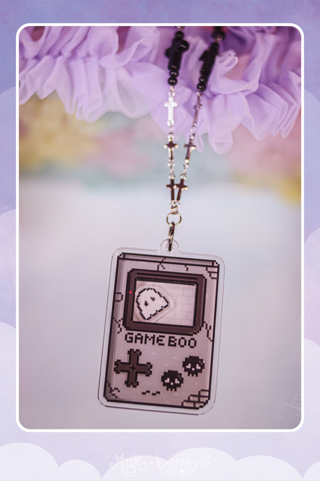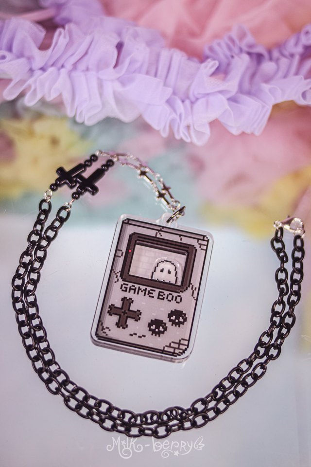 👻 Ce collier shaker représente un Game Boy pixelisé sombre, ou plutôt un Game Boo. Réalisé en acrylique, secouez-le pour être stimulé par le petit fantôme qui bouge à l'intérieur de l'écran. Il est monté sur une chaîne en acrylique noir ornée de perles fantaisie.