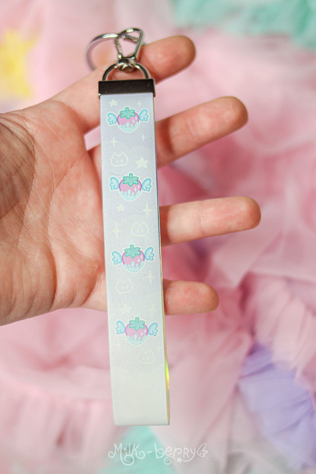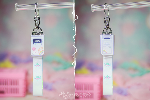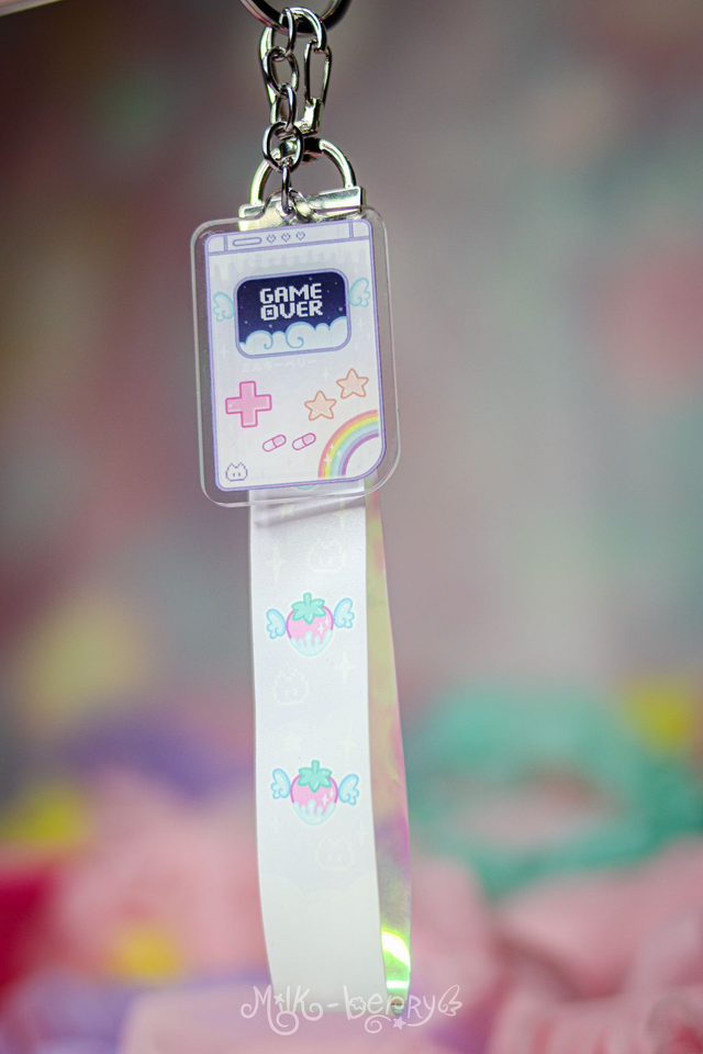 🍓 Ce lanyard holographique présente un motif de fraise ailée et s'accompagne d'un porte-clé en acrylique en forme de Gameboy Pastel. Si vous appréciez le retrogaming et le kawaii, ce sera l'accessoire idéal pour accrocher vos clés ou décorer vos sacs !