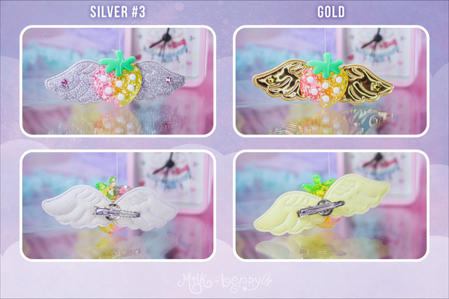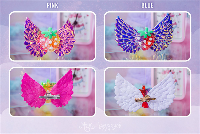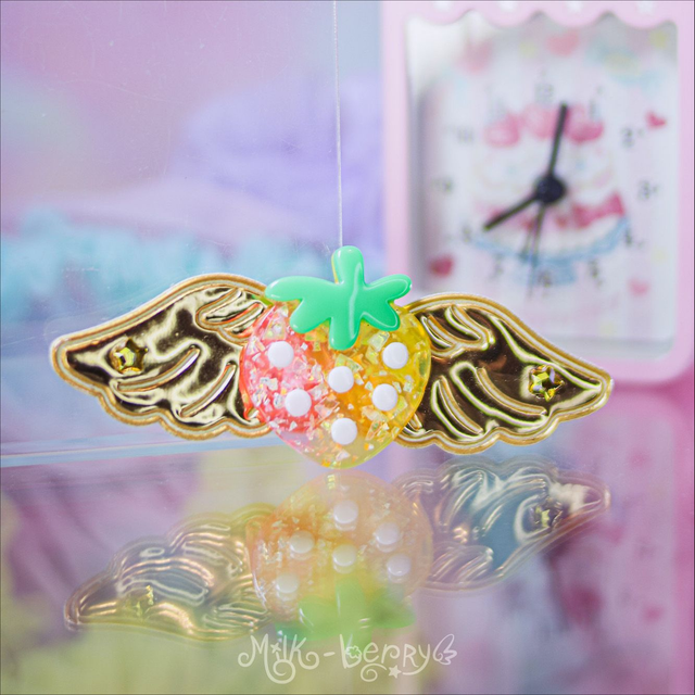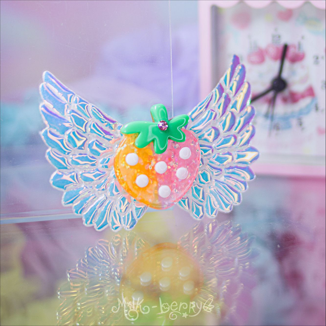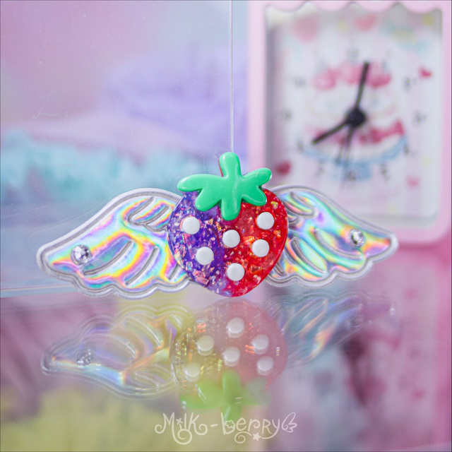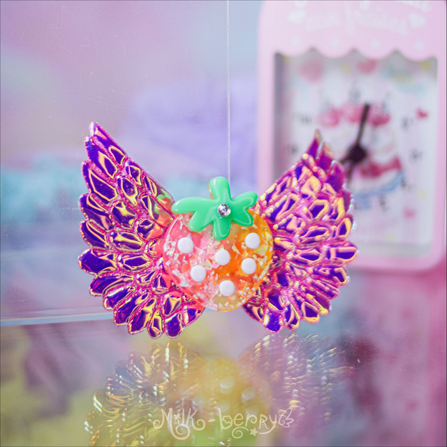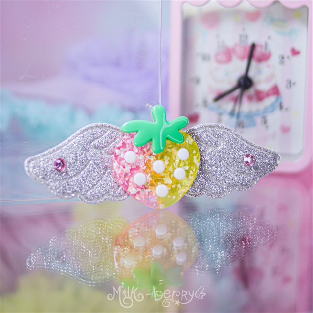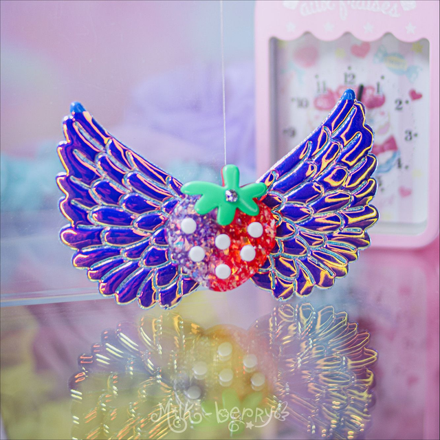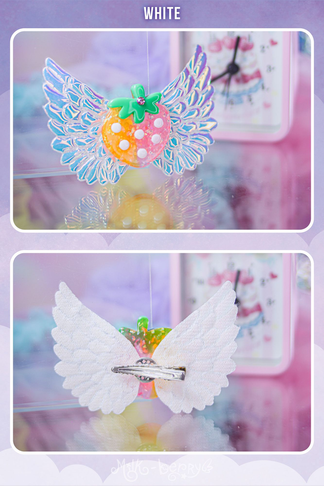 🍓 Ajoutez une touche d'éclat à votre chevelure de licorne avec les Pinces Angel Strawberry aux ailes pailletées ou irisées ! Nickel pour vos looks Lolita, Kawaii, Harajuku, Decora ou Fairy Kei.