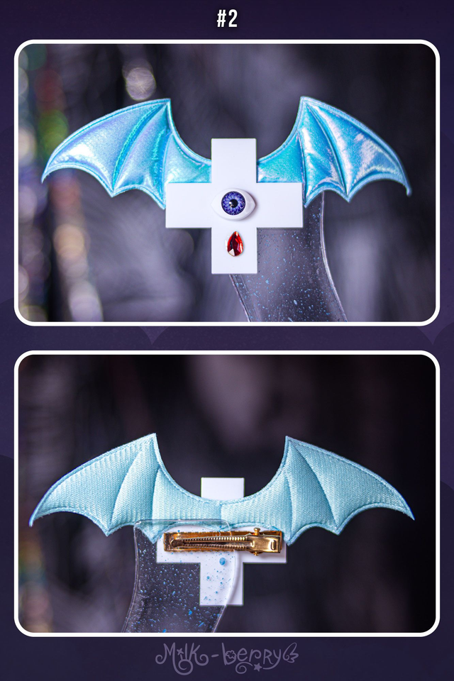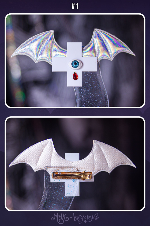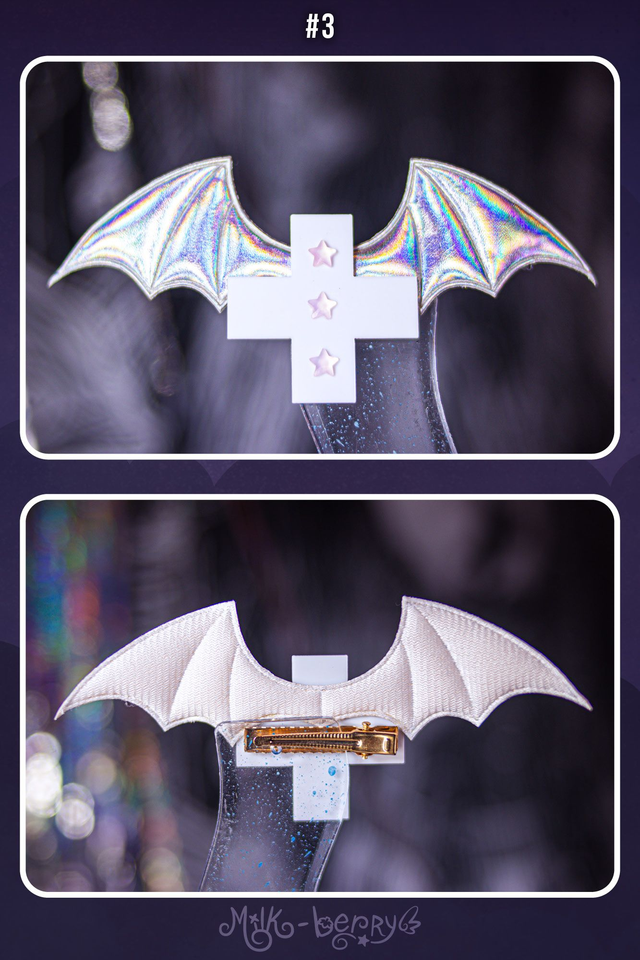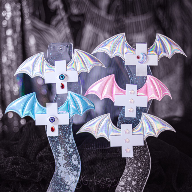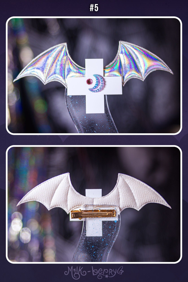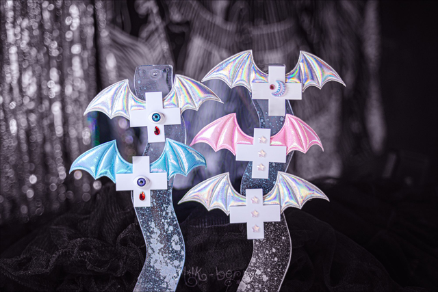 🦇 Envie d'une touche dark pour compléter vos looks ? Craquez pour une pince à cheveux en forme de croix agrémentée d'ailes de chauve-souris et de décorations fantaisie. Effet Creepy garanti ! Nickel pour un look Pastel goth.
