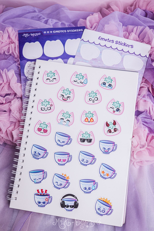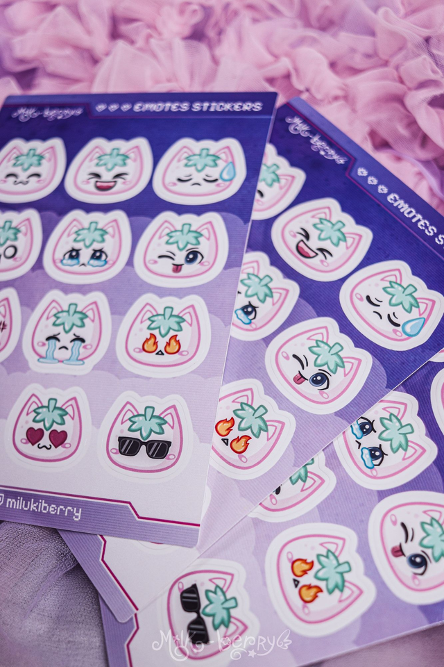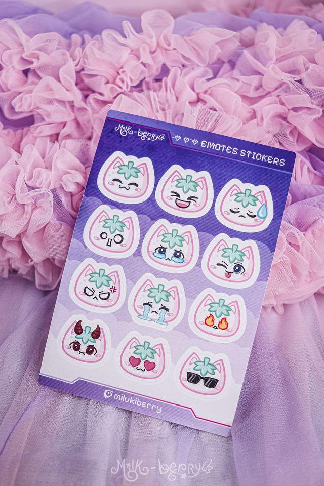 Vous aimez les autocollants mignons ? Craquez pour cette planche d'autocollants de 12 emoticons inspirés de mes emotes Twitch, présentant mon adorable petit chat fraise.