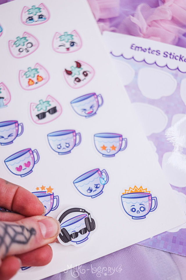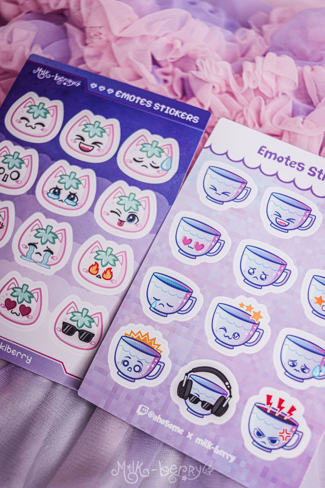 Vous aimez les autocollants mignons ? Craquez pour cette planche d'autocollants de 12 emoticons inspirées des emotes Twitch du streamer Ahosome. Parfait pour les fans de thé !