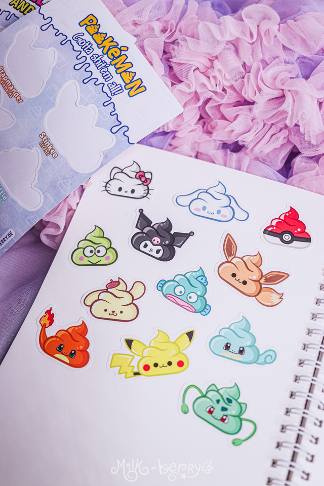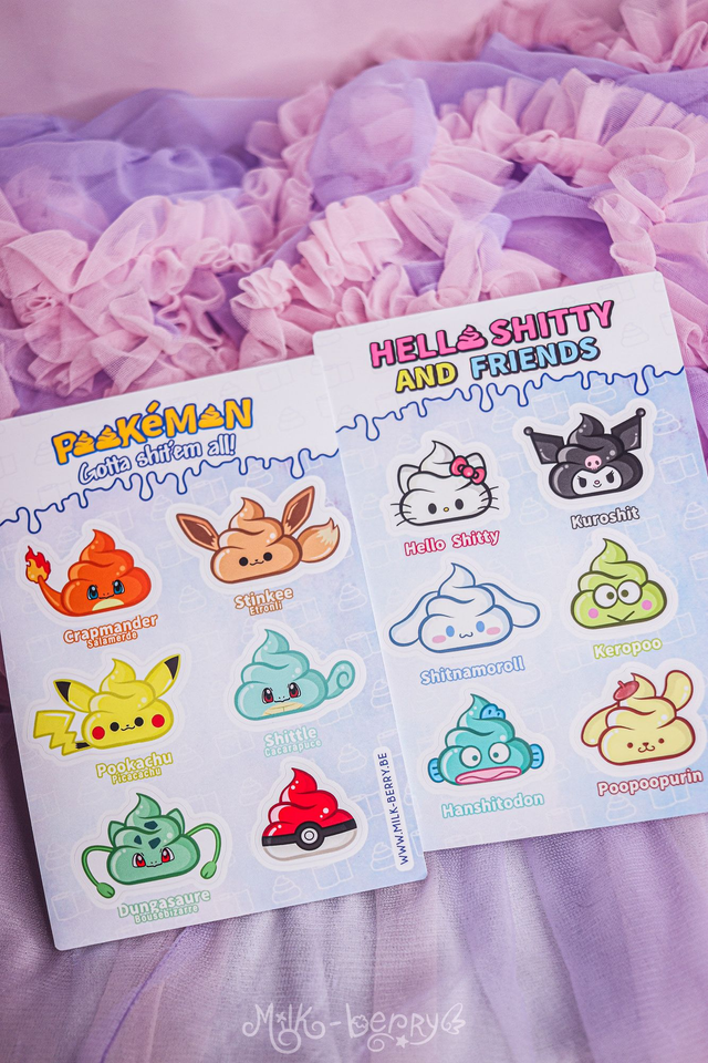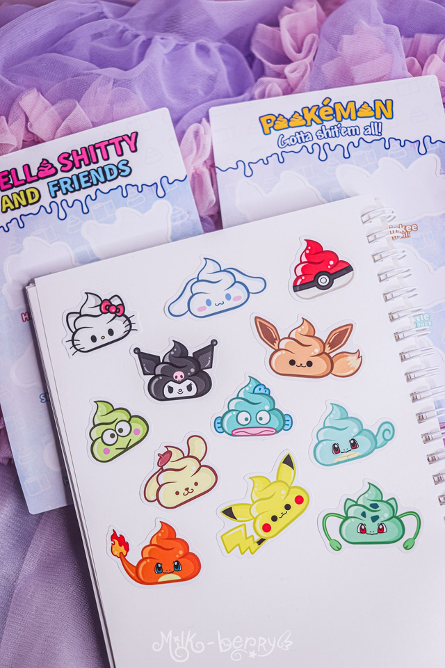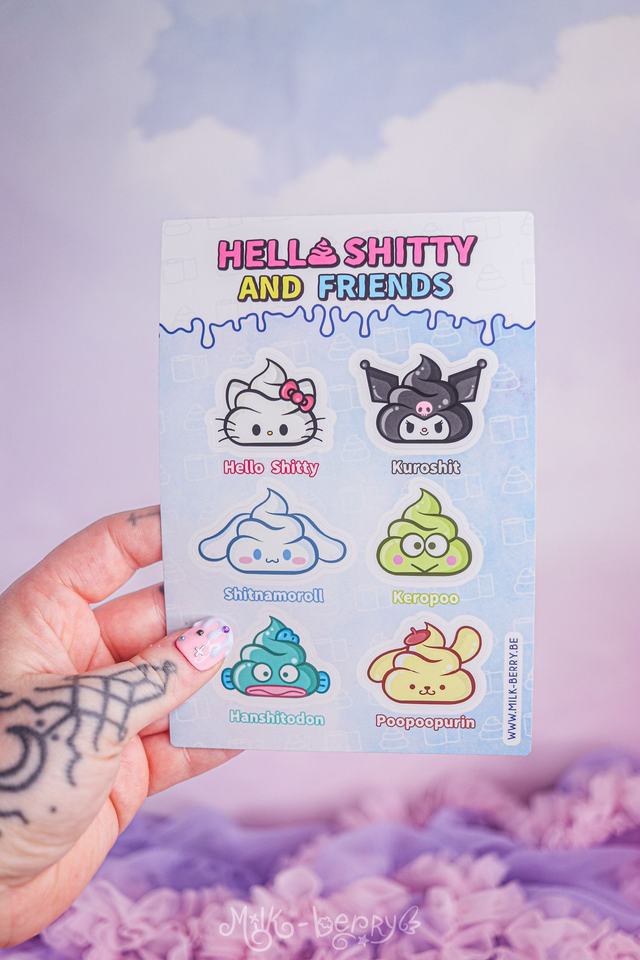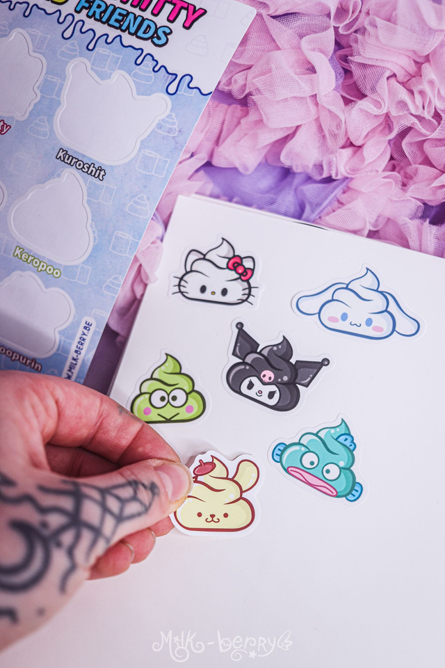 Vous aimez la Pop Culture et "l'humour de merde" ? Craquez pour cette planche d'autocollants "Hello Kitty & friends" comportant 6 autocollants parodiques des personnages en version caca kawaii !
