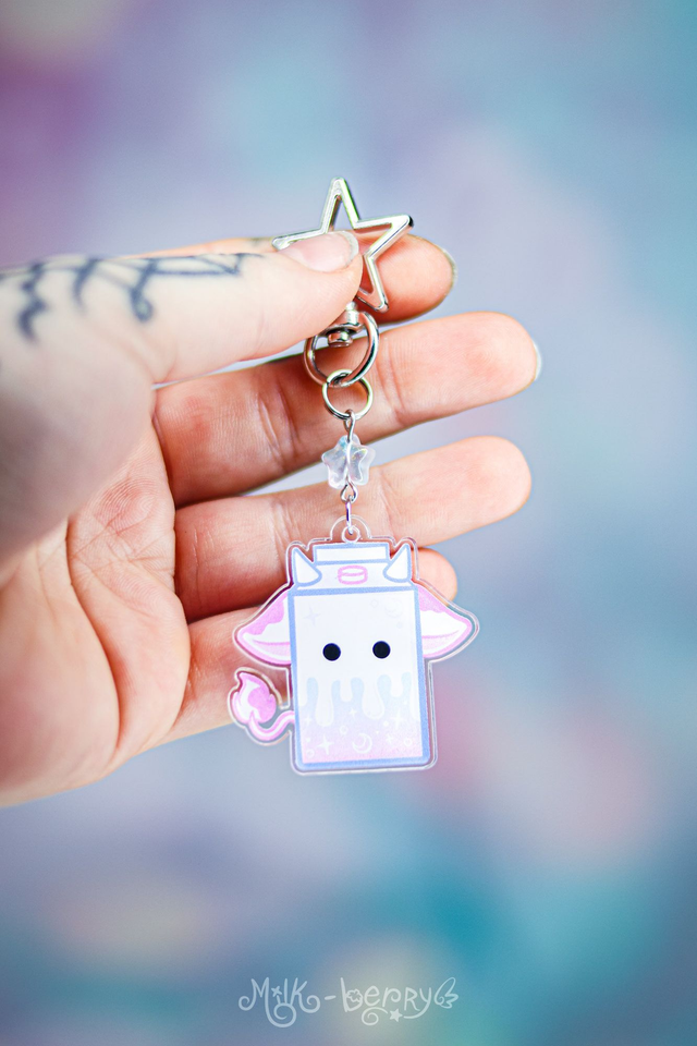 🥛 Ce porte-clé en Acrylique présente une brique de lait Kawaii avec des oreilles de vache. L'illustration a été réalisée par mes soins. C'est l'objet parfait pour accompagner vos clés, décorer vos sacs ou faire un cadeau original à vos proches.
