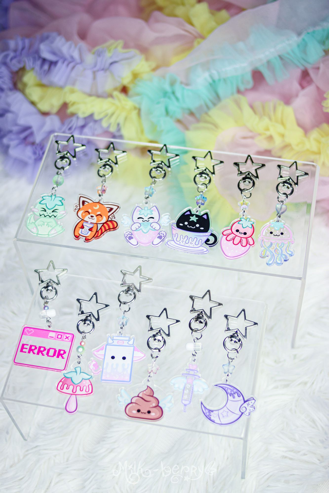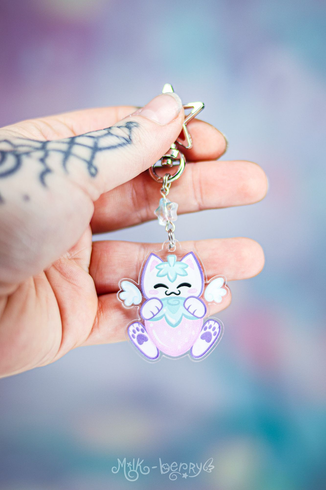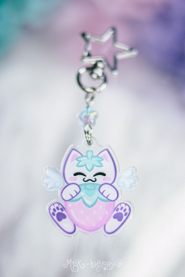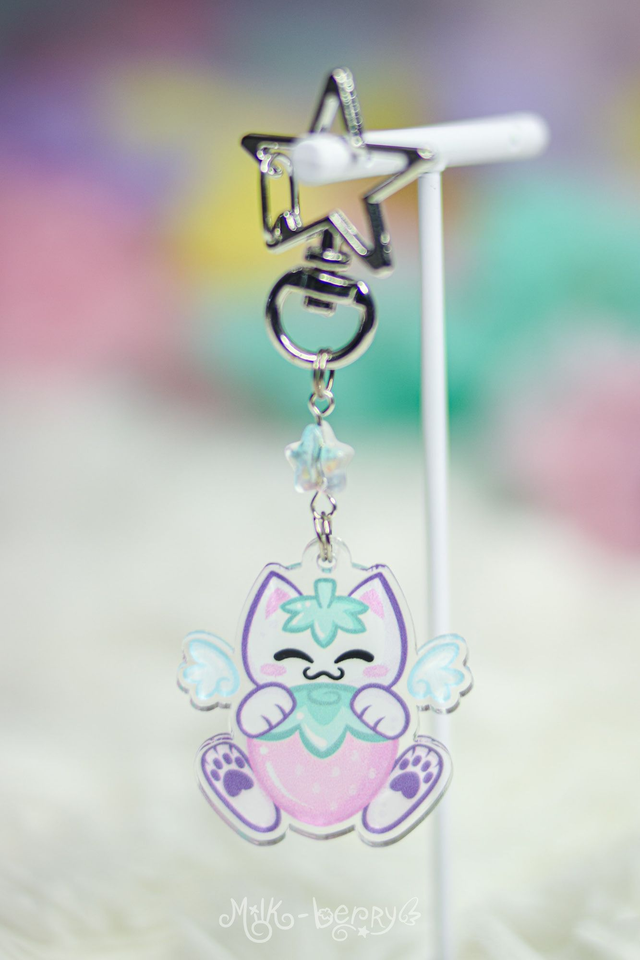🍓 Ce porte-clé en Acrylique présente un chat kawaii ailé tenant une fraise. L'illustration a été réalisée par mes soins. C'est l'objet parfait pour accompagner vos clés, décorer vos sacs ou faire un cadeau original à vos proches.