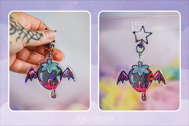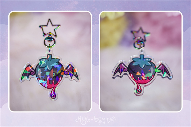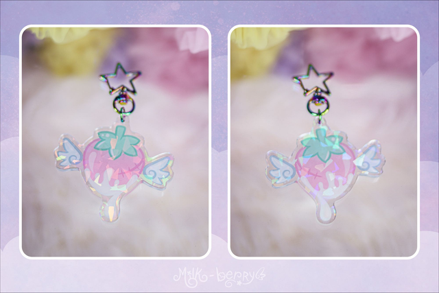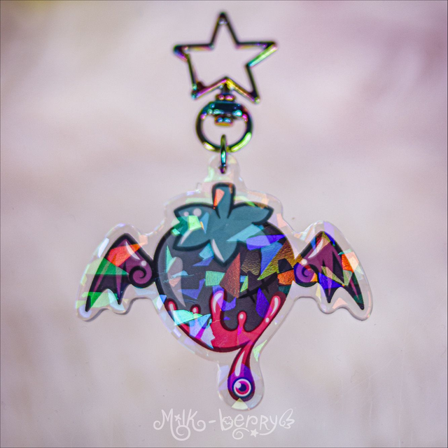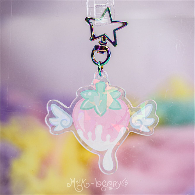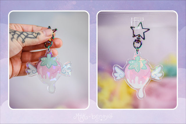🍓 Ces porte-clés holographiques kawaii présentent le logo de Milk-Berry avec sa fraise ailée dans deux versions différentes : une version kawaii aux teintes pastel avec des ailes angéliques 😇, ou une versio dark aux teintes sombres avec des ailes démoniaques 😈. Quelle team choisirez-vous ?