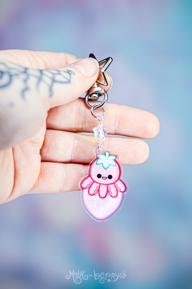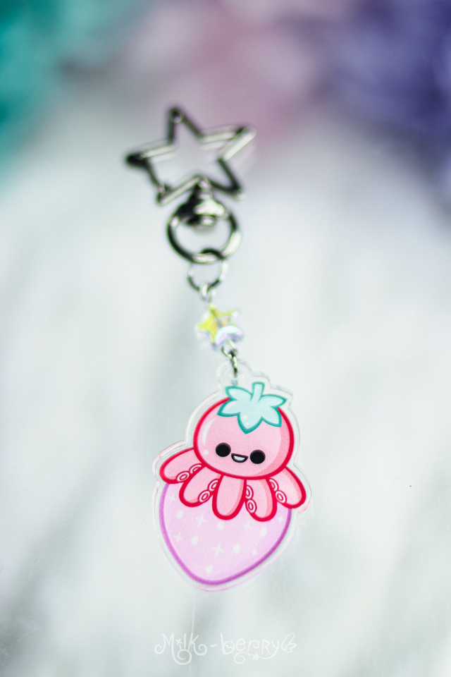 🍓 Ce porte-clé en Acrylique présente un poulpe sur une fraise. L'illustration a été réalisée par mes soins. C'est l'objet parfait pour accompagner vos clés, décorer vos sacs ou faire un cadeau original à vos proches.