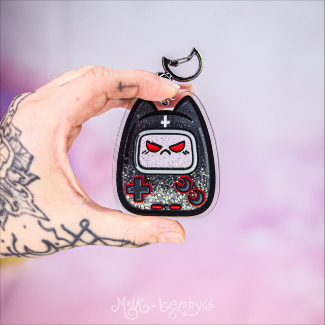 👻 Craquez pour un porte-clé shaker au style kawaii ou sombre ! Ces porte-clés stimulants en acrylique présentent un design de game boy chat en version cute ou en version dark. Ils contiennent des paillettes dans du liquide pour une stimulation visuelle des plus plaisantes.