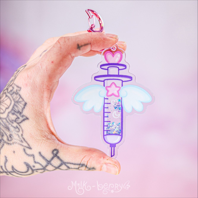 💉 Ce porte-clé shaker aux inspirations yamikawaii / menhera kei représente une seringue ailée aux couleurs pastel. Réalisé en acrylique, il contient des paillettes holographiques dans du liquide pour une stimulation visuelle des plus plaisantes.