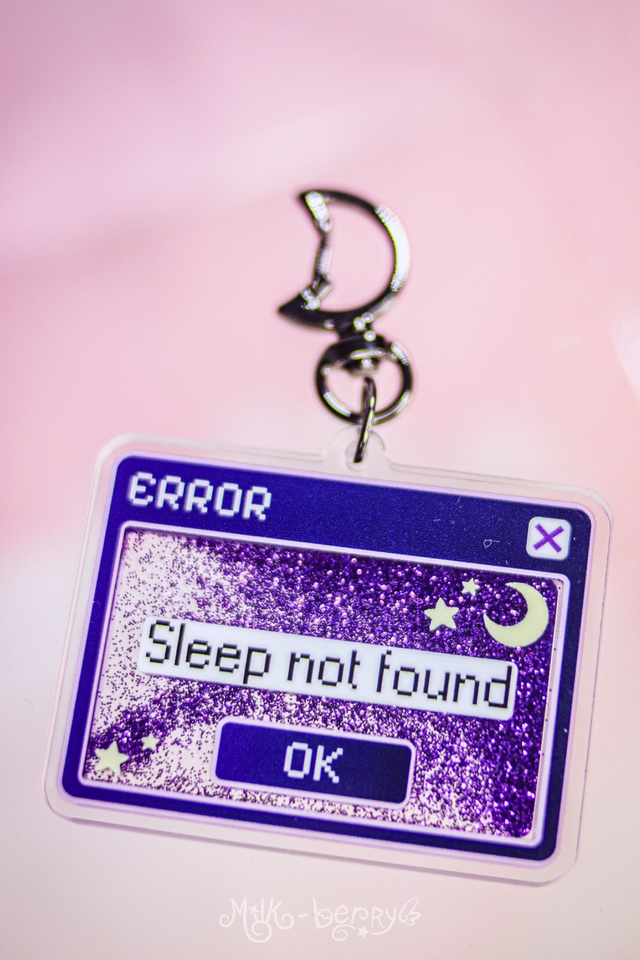 💟 Team des insomniaques ? Ce porte-clé shaker vous parlera forcément, avec sa fenêtre Error : Sleep not found. Réalisé en acrylique, il contient des paillettes mauves dans du liquide pour une stimulation visuelle des plus plaisantes.
