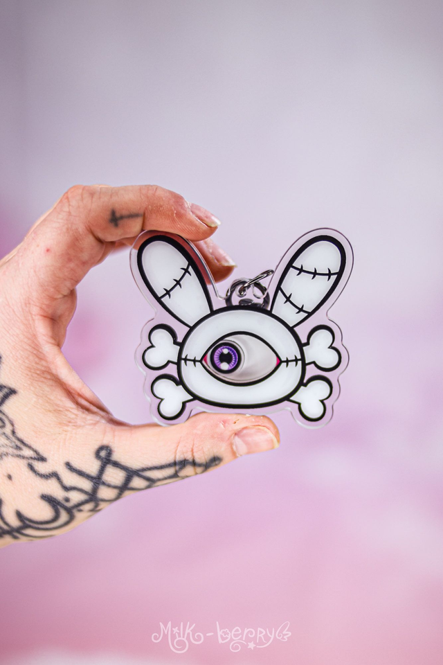👁️ Ce porte-clé shaker représente un lapin cute et trash. Réalisé en acrylique, secouez-le pour être stimulé par l'iris qui bouge à l'intérieur de l’œil.