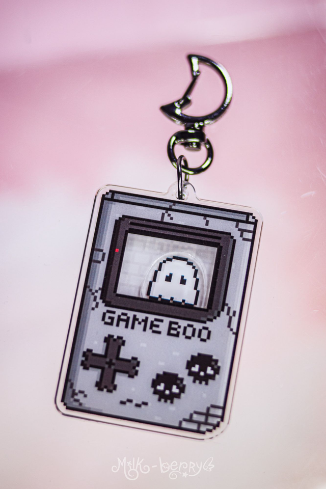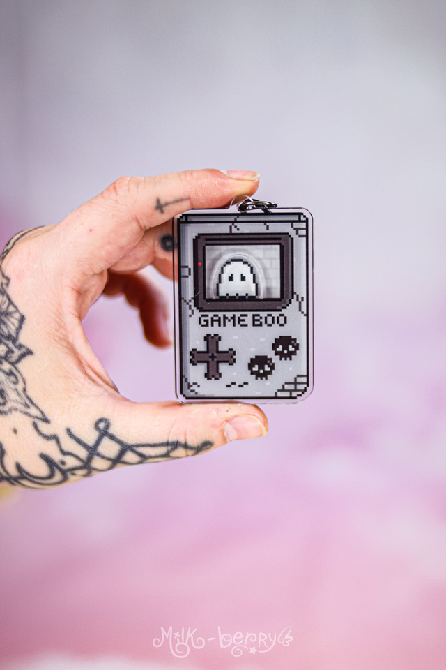 👻 Ce porte-clé shaker représente un Game Boy pixelisé sombre, ou plutôt un Game Boo. Réalisé en acrylique, secouez-le pour être stimulé par le petit fantôme qui bouge à l'intérieur de l'écran.