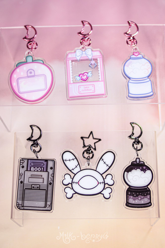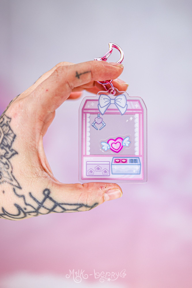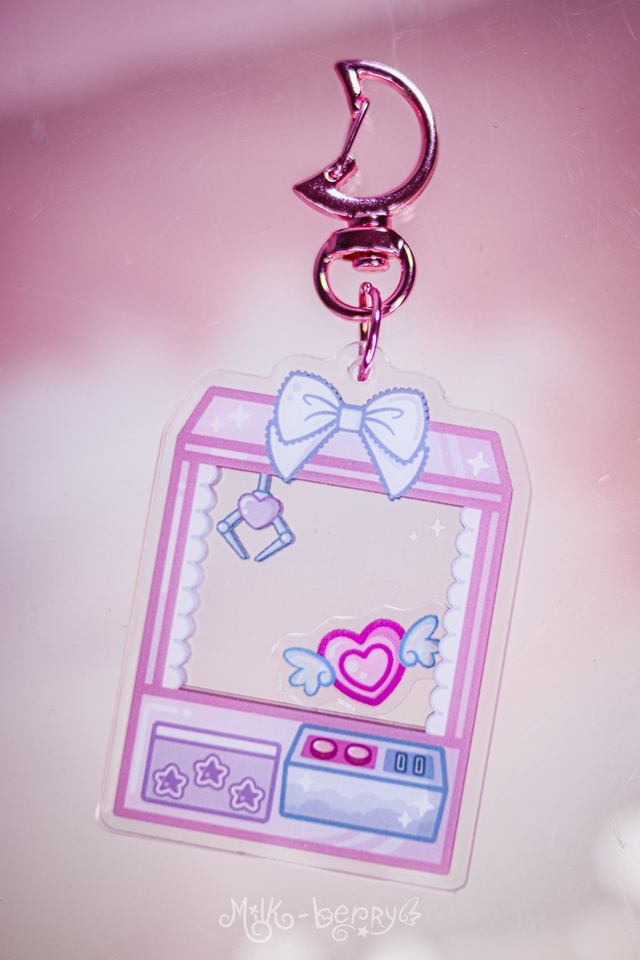 💖 Ce porte-clé shaker représente un UFO catcher façon kawaii aux teintes pastel. Réalisé en acrylique, secouez-le pour être stimulé par le petit cœur ailé qui bouge à l'intérieur de la machine à pinces.