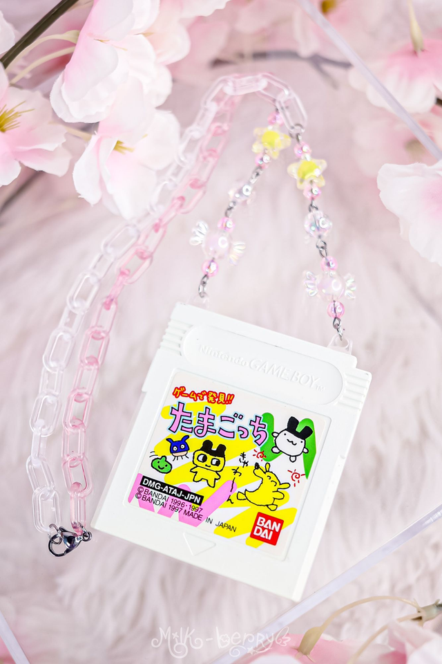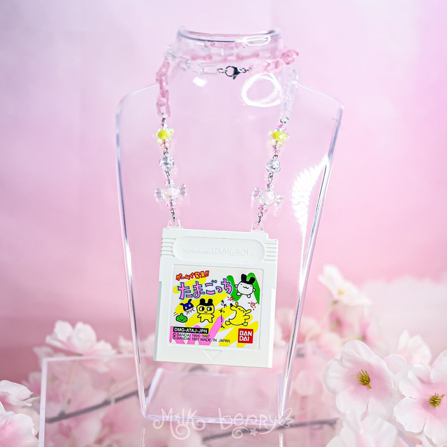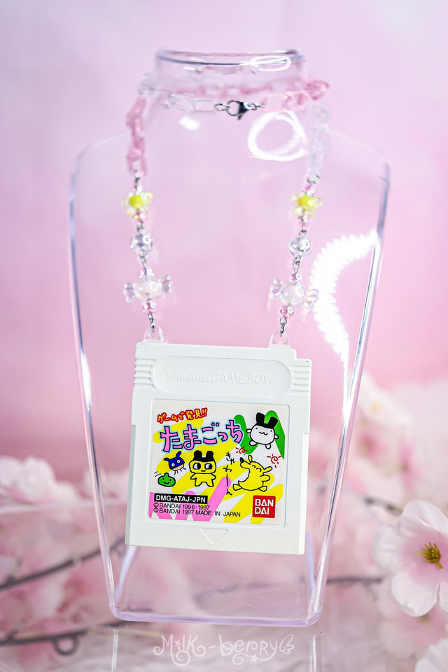 💖 Ce collier a été créé à partir d'une cartouche de jeu Game Boy Tamagotchi, trouvée dans un magasin d'occasion au Japon. Il est monté sur des chaînes en acrylique agrémentées de perles fantaisie.